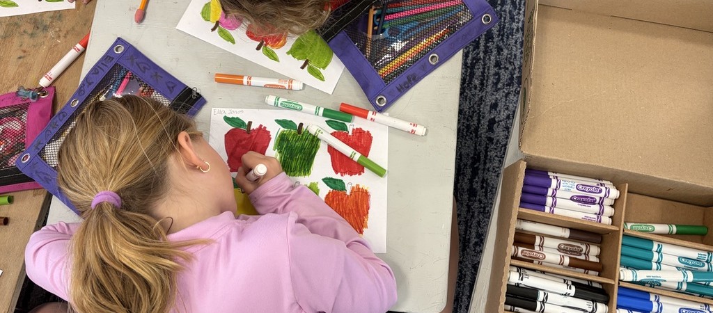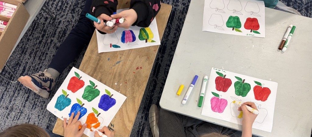 Materials: paper, paints (gouache/acrylic), an apple (for stamping), pencils, or markers.